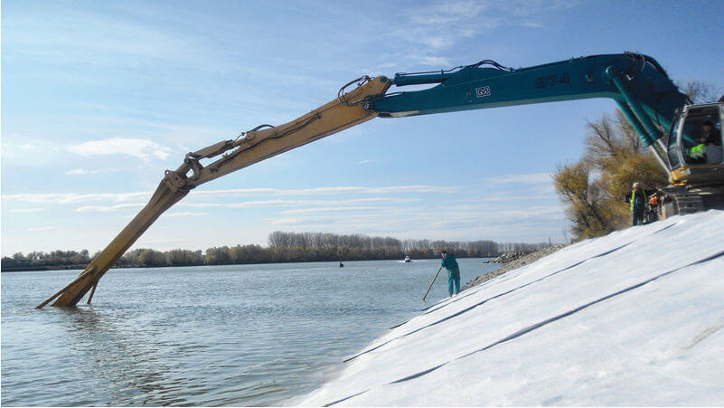 - Vải địa kỹ thuật có tính bền kéo, chống đâm thủng cao, tính bền môi trường (chịu nước mặn) và khả năng tiêu thoát nước nhanh; vải địa kỹ thuật được dùng kết hợp với một số vật liệu khác như bê tông, đá, rọ đá, thảm đá, tạo thành lớp đệm ngăn cách chống xói mòn và bảo vệ cho triền đê, bờ đập, bờ biển hay các cột bê tông cột trụ của cầu.